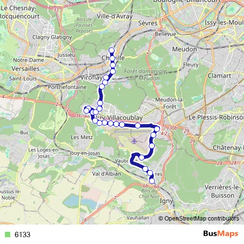 The first stop of the 6133 bus route is Gare de Bièvres and the last stop is Gare de Chaville Rive Droite. 6133 is operational during entre semana.