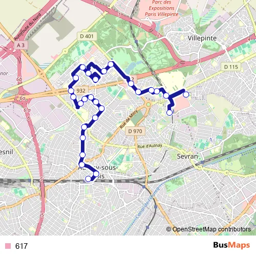 The first stop of the 617 bus route is Gare de Sevran Beaudottes and the last stop is Gare d'Aulnay-sous-Bois. 617 is operational during todos los días.