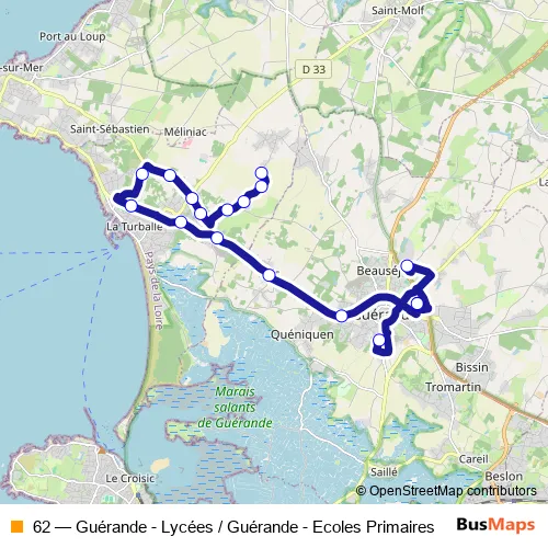 1235 Route du Fan. 62 (Guérande - Lycées / Guérande - Ecoles Primaires) is operational during entre semana.