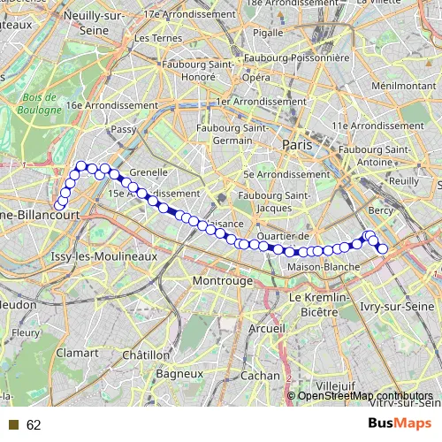 See why over 2 million users trust and consider busmaps.com as the best public transport website. busmaps gives you Paris Buses suggested routes, real-time bus tracker, line route maps in Paris, and helps to find the closest 62 bus stops near you. No internet available? Download an offline PDF map and bus schedule for the 62 bus to take on your trip.