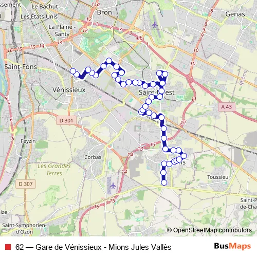 See why over 2 million users trust and consider busmaps.com as the best public transport website. busmaps gives you Lyon Buses suggested routes, real-time bus tracker, line route maps in Lyon, and helps to find the closest 62 bus stops near you. No internet available? Download an offline PDF map and bus schedule for the 62 bus to take on your trip.