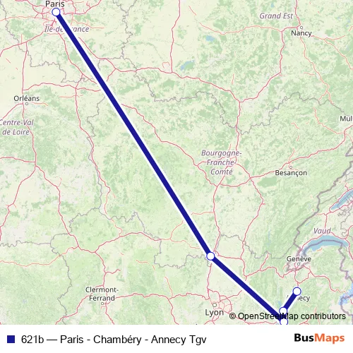 The first stop of the 621b rail route is Paris Gare de Lyon Hall 1 - 2 and the last stop is Annecy. 621b (Paris - Chambéry - Annecy Tgv) is operational during todos los días.