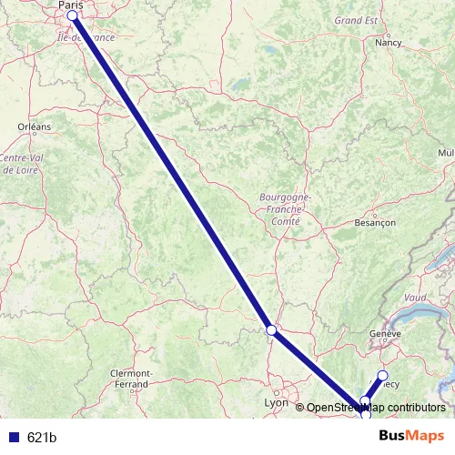 The first stop of the 621b rail route is Annecy and the last stop is Paris Gare de Lyon. 621b is operational during todos los días.
