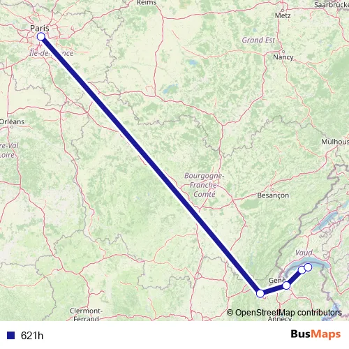 The first stop of the 621h rail route is Paris Gare de Lyon and the last stop is Evian-les-Bains. 621h is operational during los fines de semana.