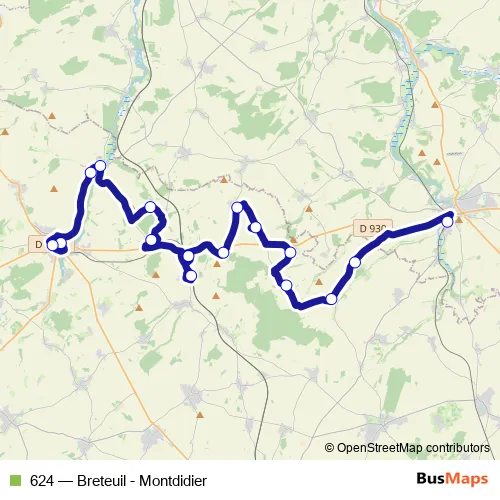 The first stop of the 624 bus route is Breteuil - Ecole La Ceriseraie and the last stop is Montdidier - Gare. 624 (Breteuil - Montdidier) is operational during entre semana.