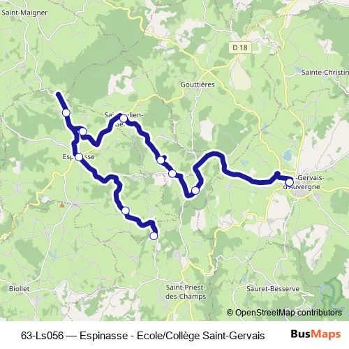 The first stop of the 63-Ls056 bus route is Collège Saint-Gervais-d'Auvergne and the last stop is La George. 63-Ls056 (Espinasse - Ecole/Collège Saint-Gervais) is operational during entre semana.