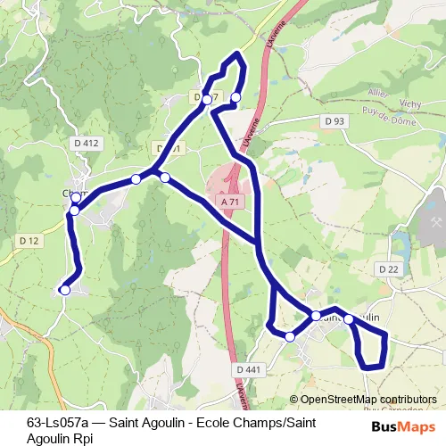The first stop of the 63-Ls057a bus route is Ecole Champs and the last stop is Ecole Champs. 63-Ls057a (Saint Agoulin - Ecole Champs/Saint Agoulin Rpi) is operational during entre semana.