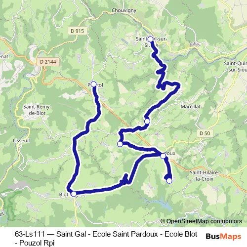 The first stop of the 63-Ls111 bus route is Ecole Pouzol and the last stop is Place de l'Eglise. 63-Ls111 (Saint Gal - Ecole Saint Pardoux - Ecole Blot - Pouzol Rpi) is operational during todos los días.