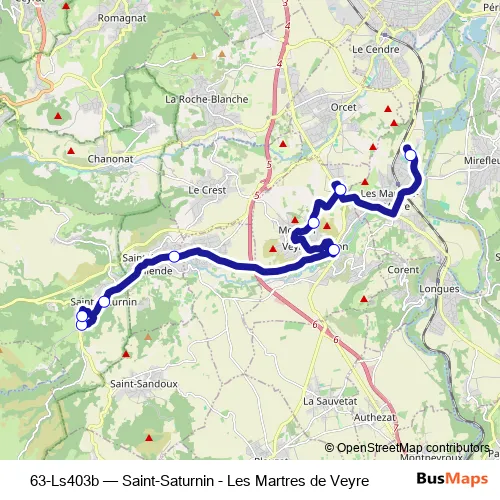 The first stop of the 63-Ls403b bus route is Collège les Martres-de-Veyre and the last stop is Chadeveau. 63-Ls403b (Saint-Saturnin - Les Martres de Veyre) is operational during entre semana.