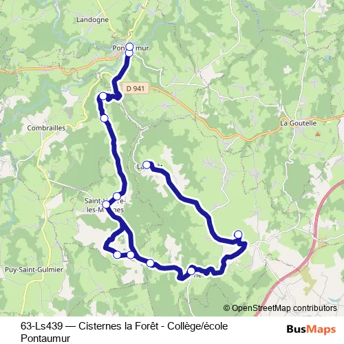 The first stop of the 63-Ls439 bus route is La Forêt and the last stop is Ecole Pontaumur. 63-Ls439 (Cisternes la Forêt - Collège/école Pontaumur) is operational during entre semana.