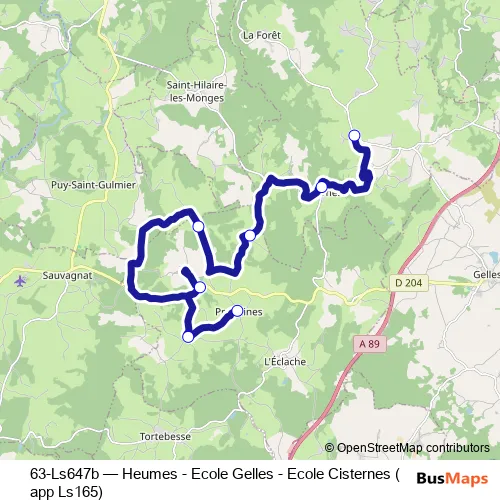 The first stop of the 63-Ls647b bus route is Ecole Maternelle Lavergne and the last stop is Bourg. 63-Ls647b (Heumes - Ecole Gelles - Ecole Cisternes (app Ls165)) is operational during todos los días.