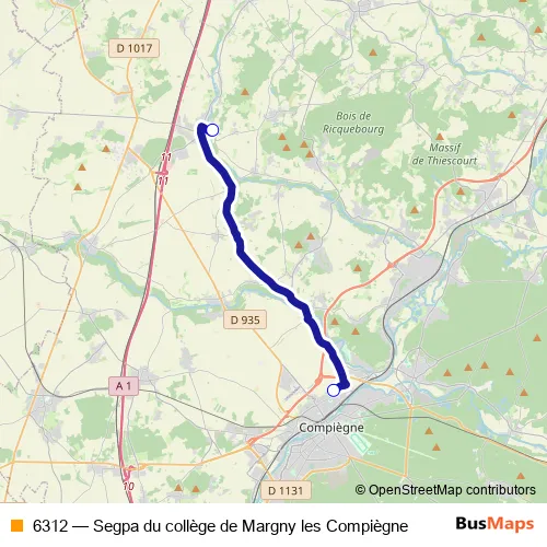 The first stop of the 6312 bus route is Margny-LES-Compiegne - Collège Claude Debussy and the last stop is Ressons-SUR-Matz - Collège La Vallée du Matz. 6312 (Segpa du collège de Margny les Compiègne) is operational during entre semana.