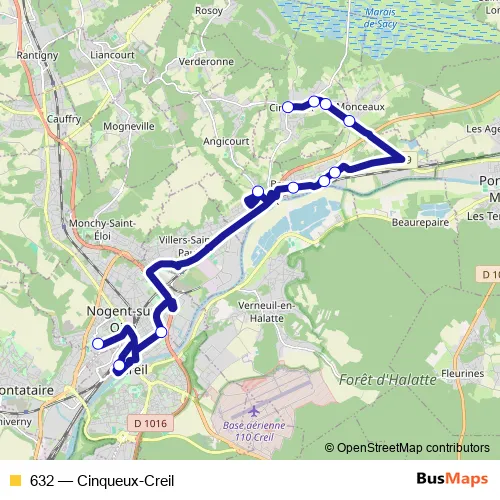 The first stop of the 632 bus route is Nogent-SUR-Oise - Lycée Marie Curie and the last stop is Cinqueux - Place. 632 (Cinqueux-Creil) is operational during entre semana.