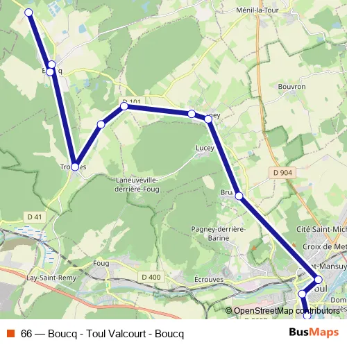The first stop of the 66 bus route is Toul - Valcourt and the last stop is Boucq - Duchesse. 66 (Boucq - Toul Valcourt - Boucq) is operational during entre semana.