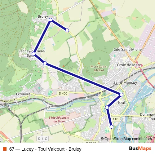 The first stop of the 67 bus route is Toul - Valcourt and the last stop is Bruley - Ferme. 67 (Lucey - Toul Valcourt - Bruley) is operational during entre semana.