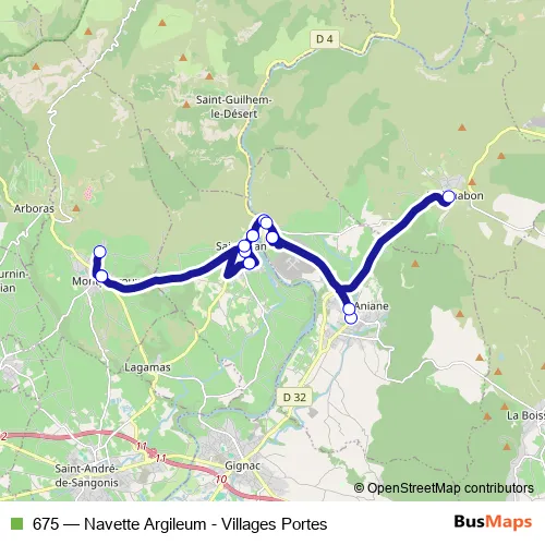 The first stop of the 675 bus route is Aniane - Grand Site and the last stop is