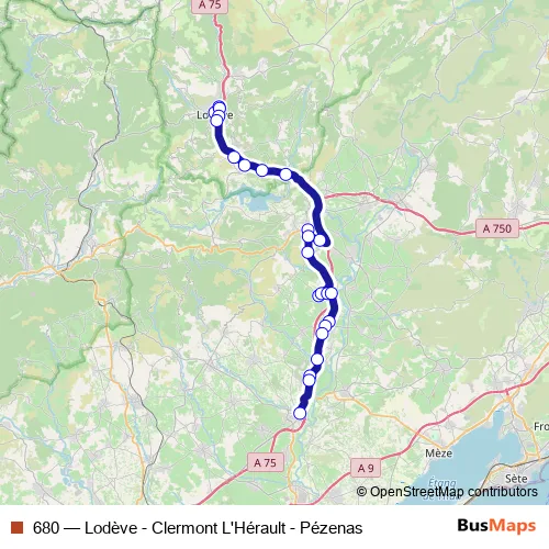 The first stop of the 680 bus route is Lodeve - Gare Routiere and the last stop is Pezenas - Gare Routiere. 680 (Lodève - Clermont L'Hérault - Pézenas) is operational during entre semana.