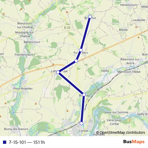 The first stop of the 7-15-101 bus route is Baizieux - Rue du Château and the last stop is Corbie - Collège Eugène Lefebvre. 7-15-101 (1511h) is operational during todos los días.