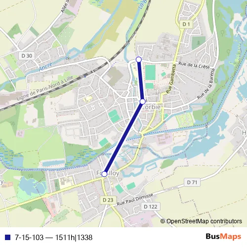 The first stop of the 7-15-103 bus route is Fouilloy - Abribus Eglise and the last stop is Corbie - Collège Eugène Lefebvre. 7-15-103 (1511h|1338) is operational during entre semana.