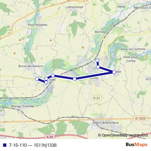 The first stop of the 7-15-110 bus route is Daours - Pôle Santé and the last stop is Corbie - Collège Eugène Lefebvre. 7-15-110 (1511h|1338) is operational during todos los días.