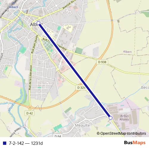 The first stop of the 7-2-142 bus route is Albert - Collège Pierre et Marie Curie and the last stop is Meaulte - Aérospatiale. 7-2-142 (1231d) is operational during entre semana.