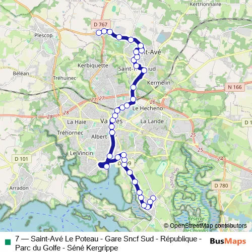 Bus 7 - Saint-Avé Le Poteau - Gare Sncf Sud - République - Parc du Golfe - Séné Kergrippe: Full Schedule in Vannes