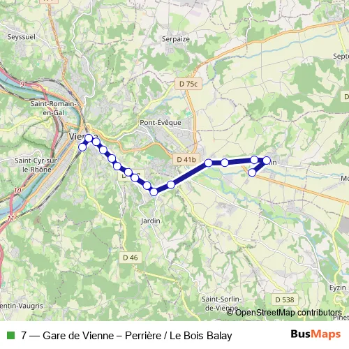 The first stop of the 7 bus route is Perrière and the last stop is Gare de Vienne Quai A. 7 (Gare de Vienne – Perrière / Le Bois Balay) is operational during todos los días.