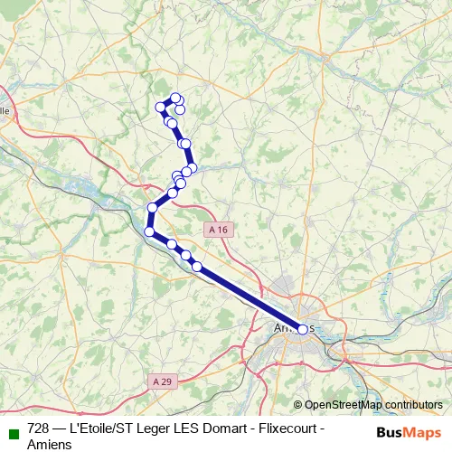 The first stop of the 728 bus route is Saint-Leger-LES-Domart - Salle des fêtes and the last stop is Amiens - Gare routière. 728 (L'Etoile/ST Leger LES Domart - Flixecourt - Amiens) is operational during todos los días.