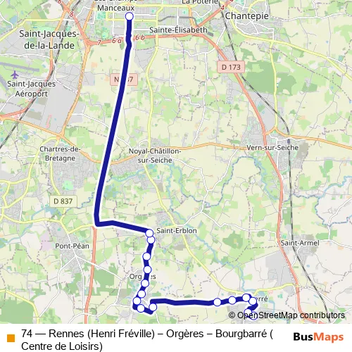 Click here to view the nearest 74 - Rennes (Henri Fréville) – Orgères – Bourgbarré (Centre de Loisirs) bus stop.