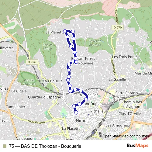 See why over 2 million users trust and consider busmaps.com as the best public transport website. busmaps gives you Nimes Buses suggested routes, real-time bus tracker, line route maps in Nimes, and helps to find the closest 75 bus stops near you. No internet available? Download an offline PDF map and bus schedule for the 75 bus to take on your trip.