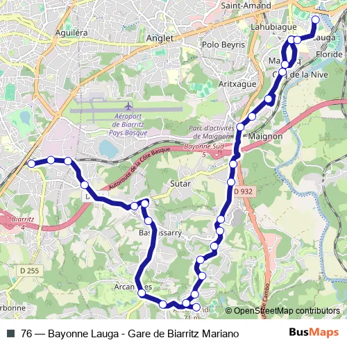 The first stop of the 76 bus route is Gare de Biarritz Mariano and the last stop is Lauga. 76 (Bayonne Lauga - Gare de Biarritz Mariano) is operational during entre semana.