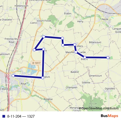 The first stop of the 8-11-204 bus route is Roye - Collège Louise Michel and the last stop is Cressy-Omencourt - Abri Bus Rd. 8-11-204 (1327) is operational during todos los días.