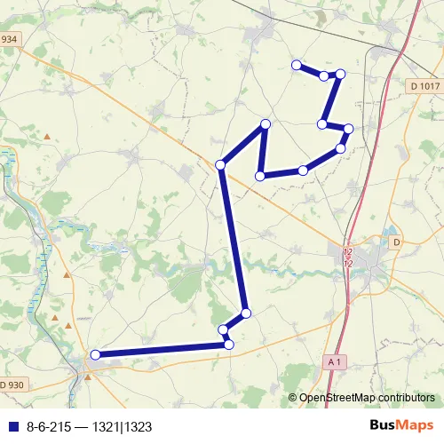 The first stop of the 8-6-215 bus route is Montdidier - Parking Collège et Lycée and the last stop is Meharicourt - Mairie. 8-6-215 (1321|1323) is operational during todos los días.