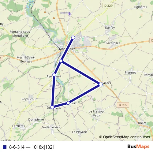 The first stop of the 8-6-314 bus route is Montdidier - Cité du Nord and the last stop is Montdidier - Cité du Nord. 8-6-314 (1018x|1321) is operational during todos los días.