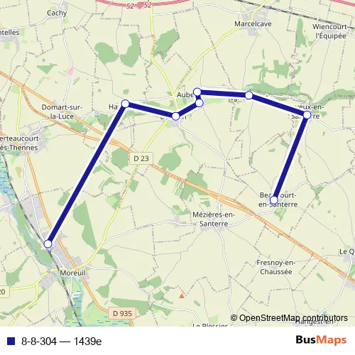 The first stop of the 8-8-304 bus route is Moreuil - Collège Jean Moulin and the last stop is Beaucourt-EN-Santerre - Grande Rue. 8-8-304 (1439e) is operational during todos los días.