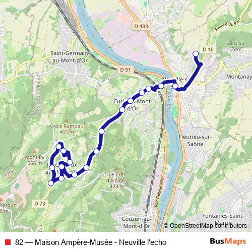 The first stop of the 82 bus route is Maison Ampère - Musée and the last stop is Neuville l'écho. 82 (Maison Ampère-Musée - Neuville l'echo) is operational during entre semana.