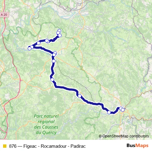 The first stop of the 876 bus route is Padirac - Gouffre and the last stop is Figeac - Gare Sncf. 876 (Figeac - Rocamadour - Padirac) is operational during todos los días.