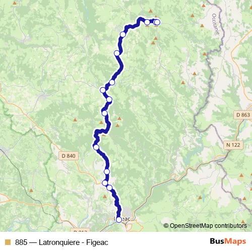 The first stop of the 885 bus route is Latronquière - Bourg and the last stop is Figeac - Gare Routière. 885 (Latronquiere - Figeac) is operational during entre semana.