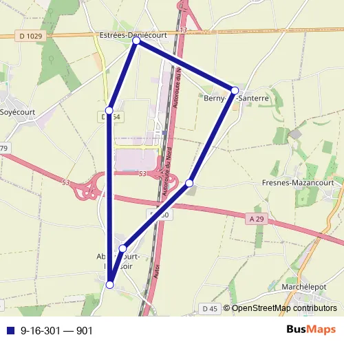 The first stop of the 9-16-301 bus route is Estrees-Deniecourt - Ecole primaire and the last stop is Estrees-Deniecourt - Ecole primaire. 9-16-301 (901) is operational during todos los días.