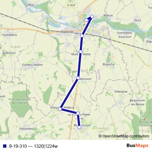 The first stop of the 9-19-310 bus route is HAM - Collège Notre Dame and the last stop is Berlancourt - Centre. 9-19-310 (1320|1224w) is operational during todos los días.
