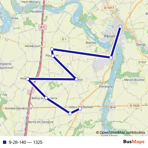 The first stop of the 9-28-140 bus route is Villers-Carbonnel - Ecole and the last stop is Peronne - Lycée P. M. France. 9-28-140 (1325) is operational during entre semana.