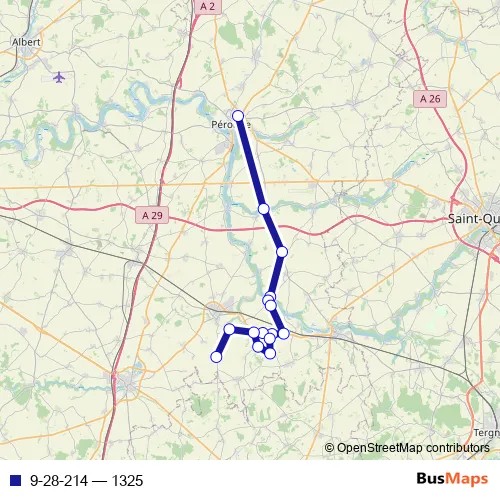 The first stop of the 9-28-214 bus route is Peronne - Lycée P. M. France and the last stop is Cressy-Omencourt - Abri Bus Rd. 9-28-214 (1325) is operational during todos los días.