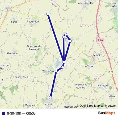 The first stop of the 9-30-108 bus route is Heudicourt - Ferme du Revelon and the last stop is Roisel - Collège Gaston Boucourt. 9-30-108 (0050v) is operational during todos los días.