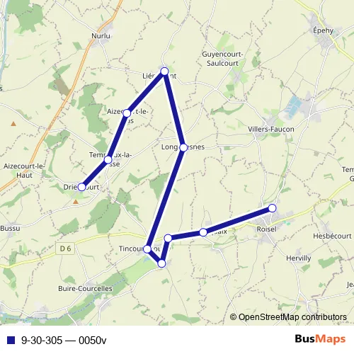 The first stop of the 9-30-305 bus route is Roisel - Collège Gaston Boucourt and the last stop is Driencourt - Abri Mairie. 9-30-305 (0050v) is operational during todos los días.
