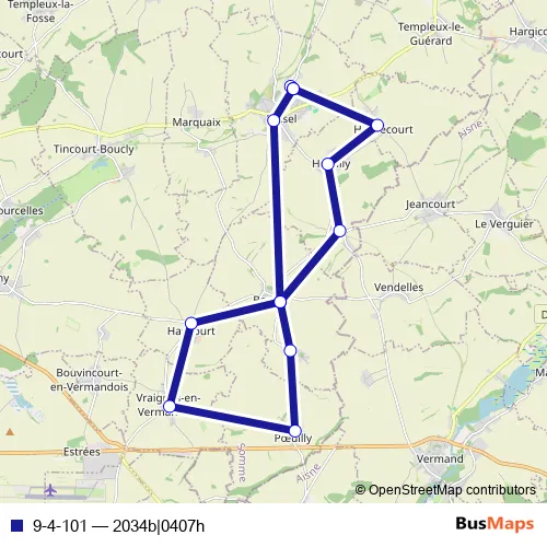 The first stop of the 9-4-101 bus route is Roisel - Collège Gaston Boucourt and the last stop is Roisel - Ecole maternelle. 9-4-101 (2034b|0407h) is operational during todos los días.