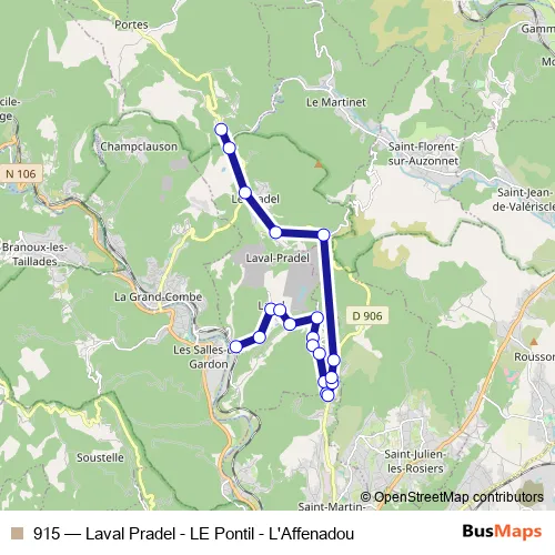The first stop of the 915 bus route is Le Mazel and the last stop is Ecole Affenadou. 915 (Laval Pradel - LE Pontil - L'Affenadou) is operational during todos los días.