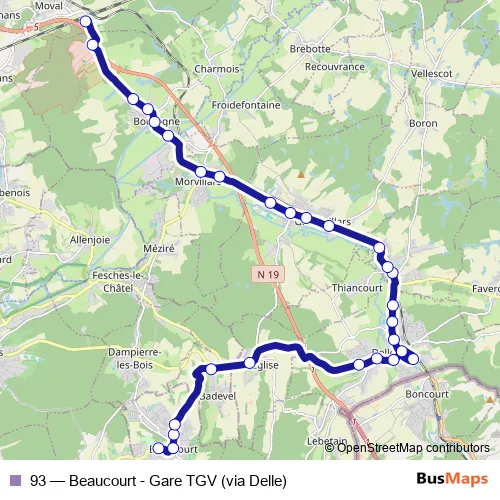 The first stop of the 93 bus route is Fonteneilles and the last stop is Gare Tgv. 93 (Beaucourt - Gare TGV (via Delle)) is operational during todos los días.
