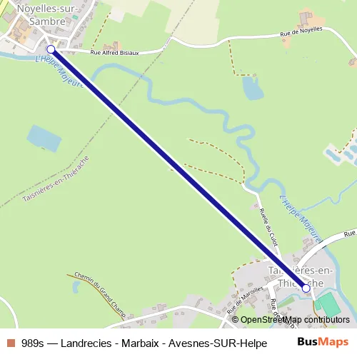 The first stop of the 989s bus route is Noyelles-SUR-Sambre - Ecole and the last stop is Taisnieres-EN-Thierache - Ecole. 989s (Landrecies - Marbaix - Avesnes-SUR-Helpe) is operational during entre semana.