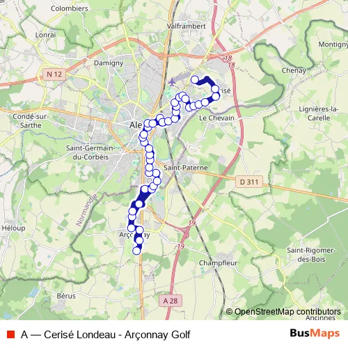 The first stop of the A bus route is Arçonnay Golf and the last stop is Londeau. A (Cerisé Londeau - Arçonnay Golf) is operational during todos los días.