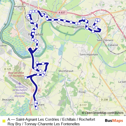 The first stop of the A bus route is Les Cordries and the last stop is Les Fontenelles. A (Saint-Agnant Les Cordries / Echillais / Rochefort Roy Bry / Tonnay-Charente Les Fontenelles) is operational during todos los días.
